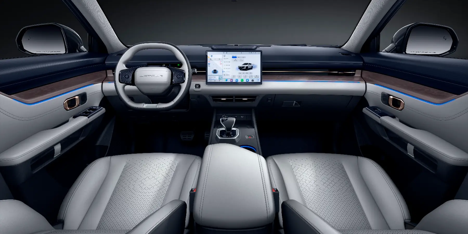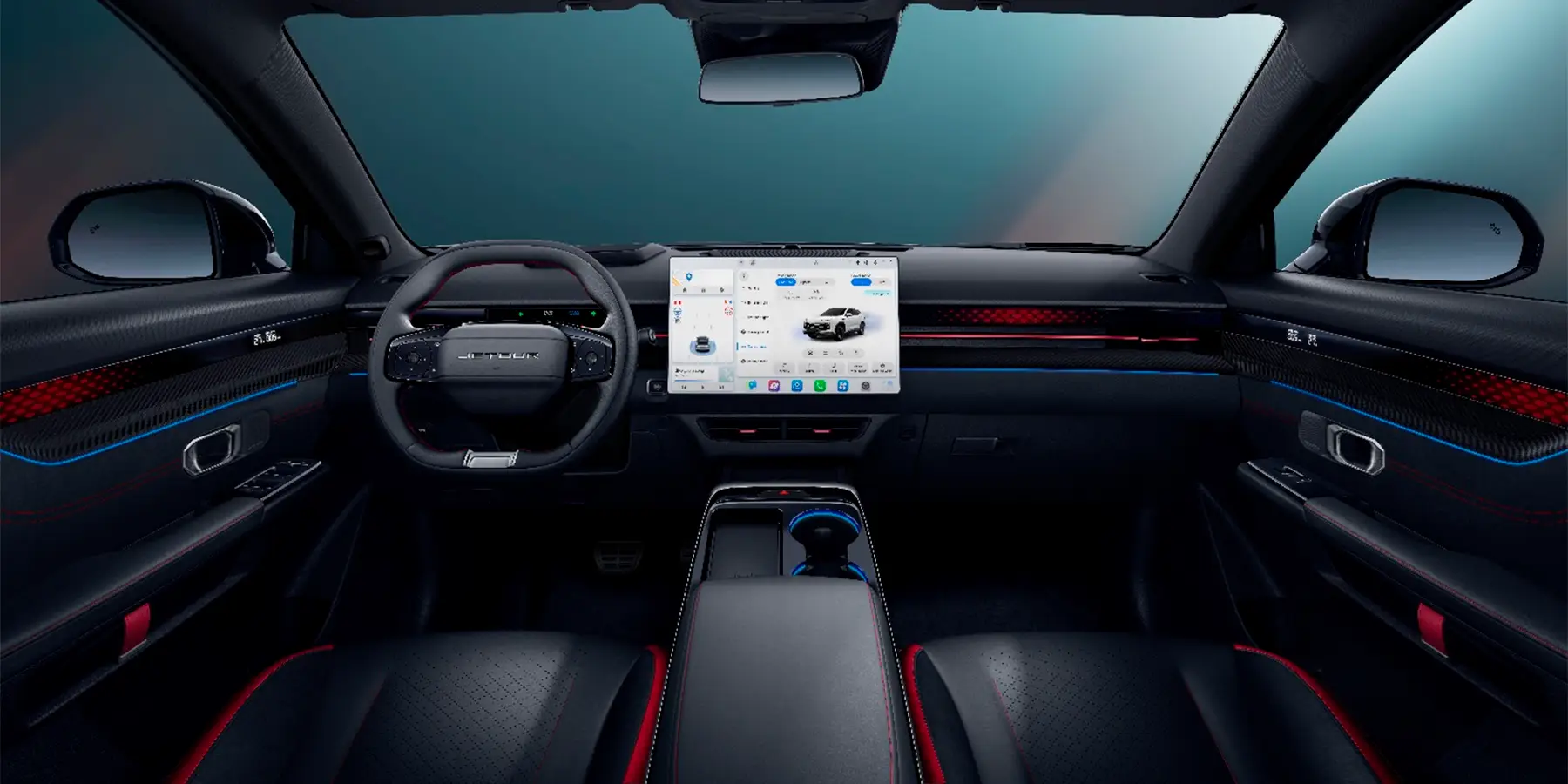 Палитра кузова включает 5 цветовых решений: «Галактический черный», «Лунный белый», «Шелковый красный», «Ванильный голубой» и «Призрачный серый». При этом Jetour предлагает клиентам два варианта цветового исполнения салона: красно-черный и серо-белый.